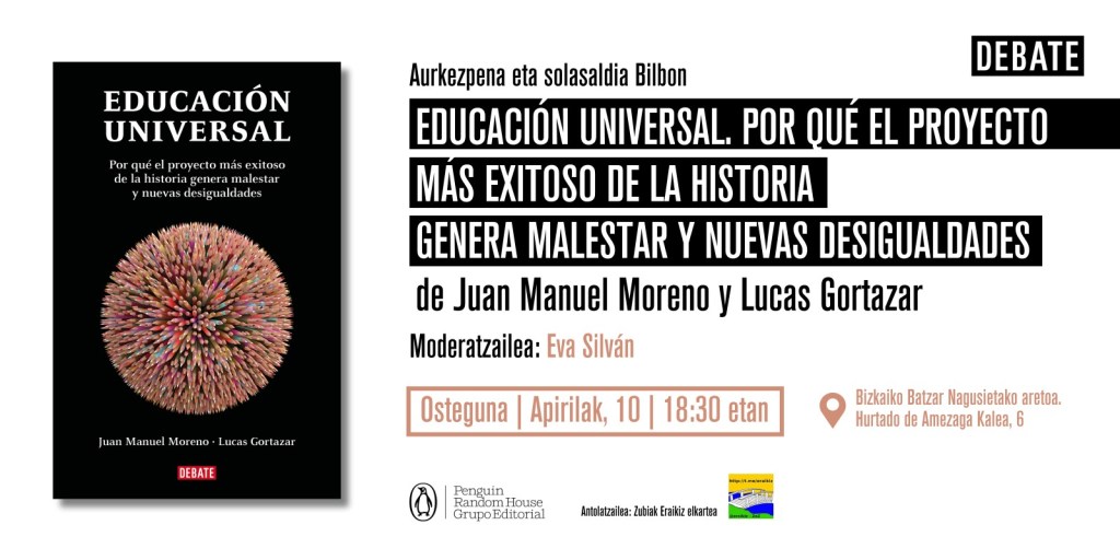Auspiciada por la asociación Zubiak Eraikiz el próximo jueves, 10/04/2025, se hará la presentación en Bilbao (salón de actos de las JJ.GG. en la calle Hurtado de Amezga, 18,30 de la tarde) del libro “Educación universal. Por qué el proyecto más exitoso de la historia genera malestar y nuevas desigualdades”, que ya lleva unas cuantas semanas a la venta con notable éxito mediático para tratarse de una temática sectorial, si bien los análisis sociológicos y políticos están muy presentes en sus páginas.